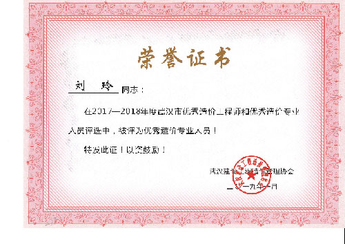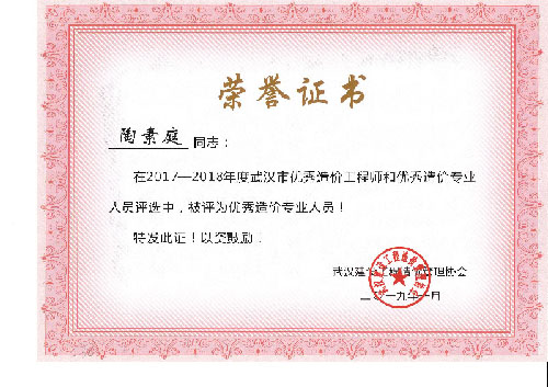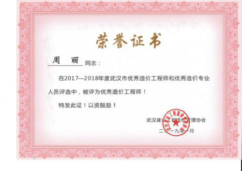 與時(shí)俱進(jìn)、開(kāi)拓進(jìn)取——熱烈祝賀我司周麗等6名同志榮獲“2017-2018年度武漢市優(yōu)秀造價(jià)工程師和優(yōu)秀造價(jià)專業(yè)人員”